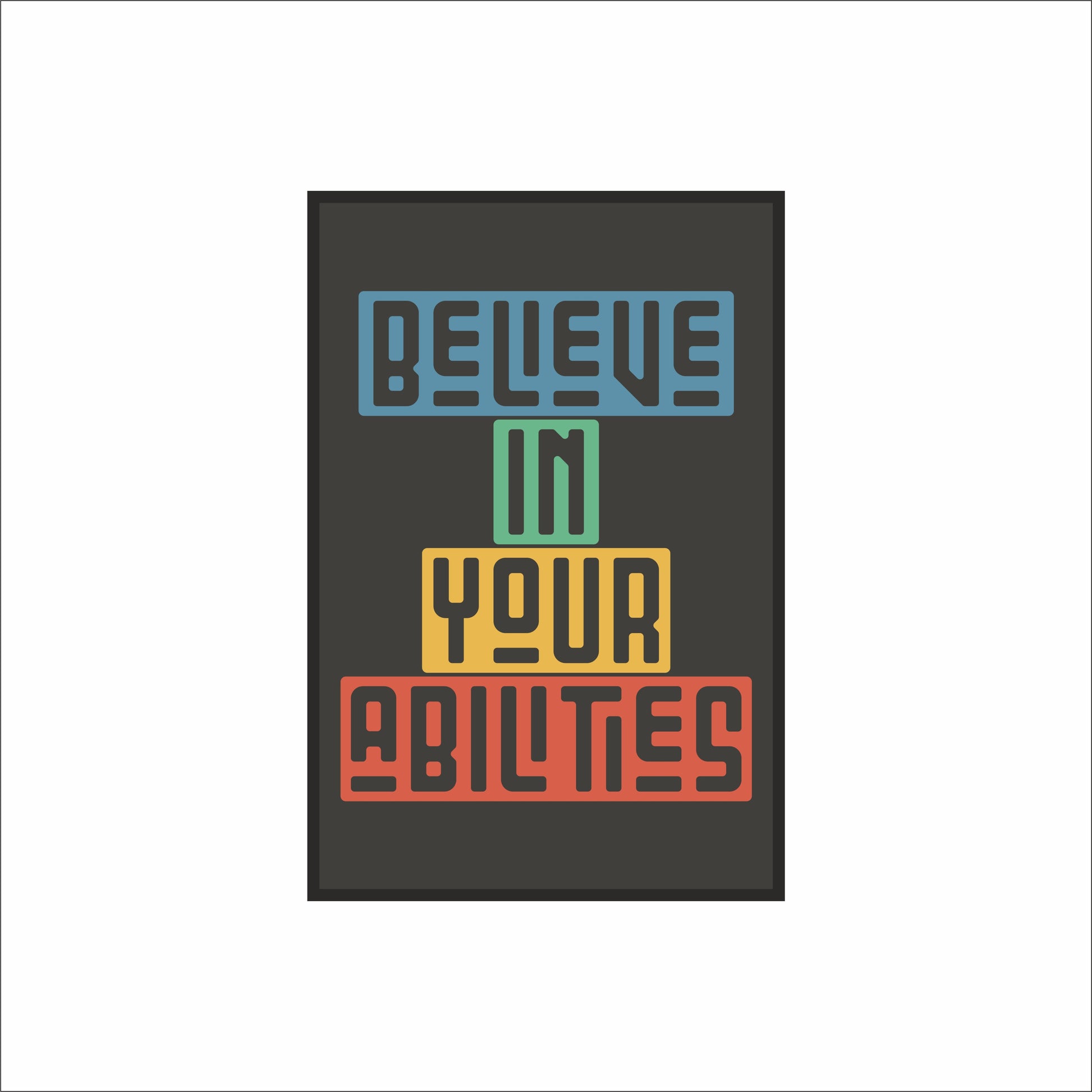This bold typography artwork delivers a clear and empowering message — “Believe in Your Abilities.” Designed with stacked geometric lettering and a balanced color-block layout, this piece brings confidence, positivity, and focus into any space. The muted yet vibrant color palette stands out beautifully against the dark background, creating a strong visual impact without being overwhelming.