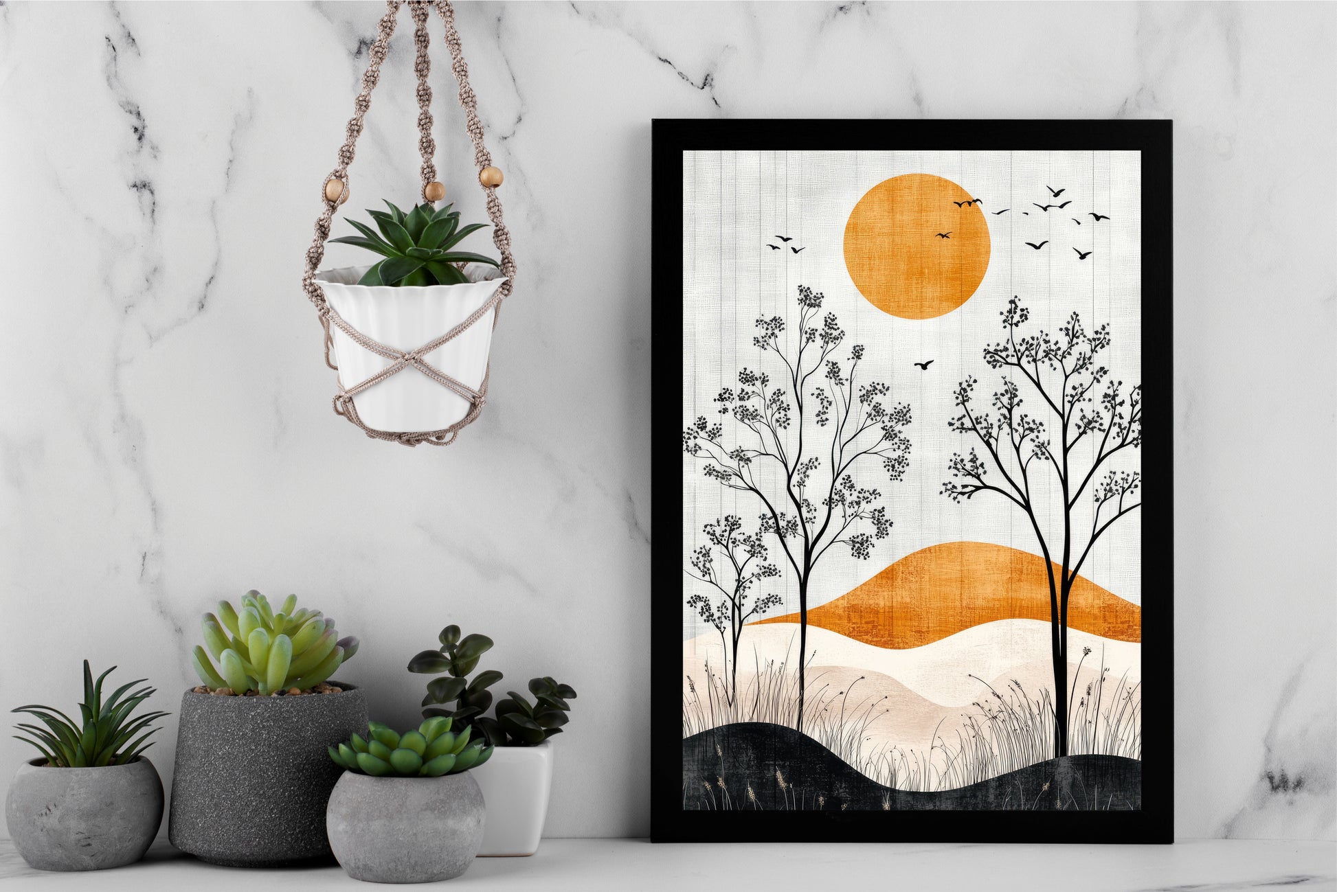 This elegant artwork captures the calm beauty of nature with a minimal and modern touch. Soft hills, delicate trees, flying birds, and a warm golden sun come together to create a peaceful and balanced composition. The subtle textures and earthy tones give it a soothing, timeless feel.