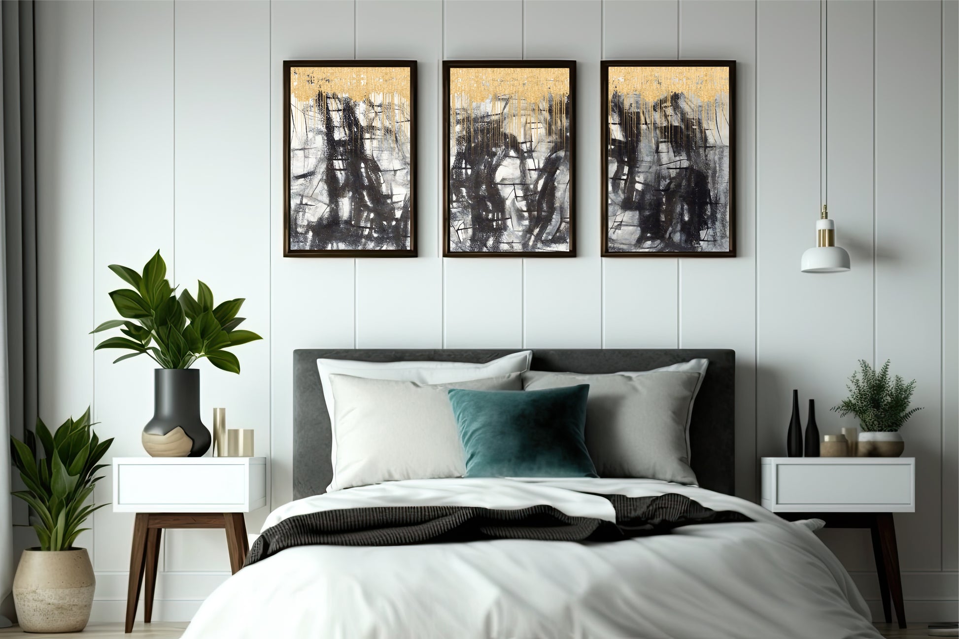This striking abstract triptych blends bold black textures with soft gold highlights, creating a powerful contrast between depth and light.