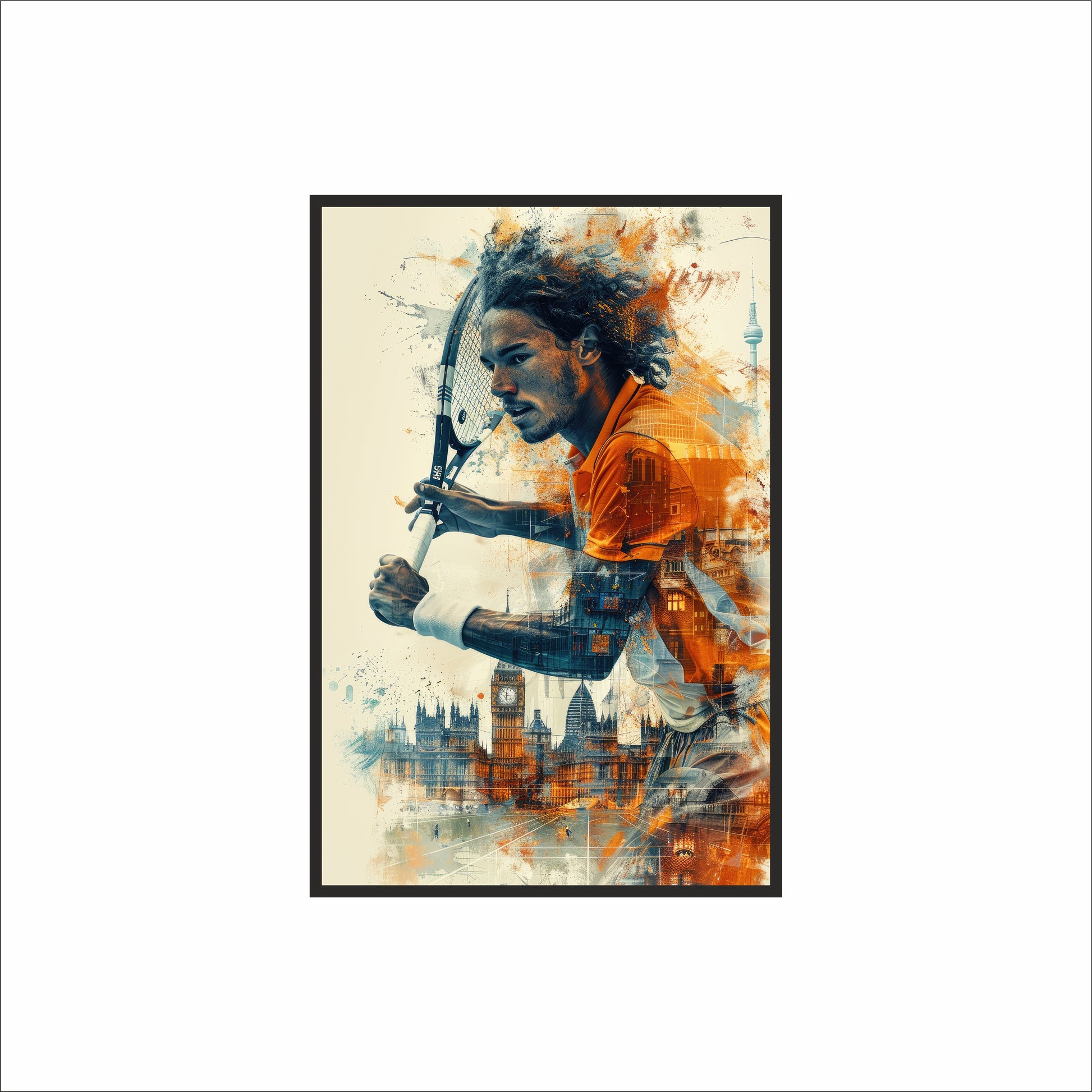 A stunning double-exposure style artwork capturing a focused tennis athlete in mid-action, blended seamlessly with an urban cityscape. Fiery orange strokes and cool blue tones merge to create a powerful fusion of motion, intensity, and modern art. This frame delivers high-energy vibes perfect for any sports-themed space.